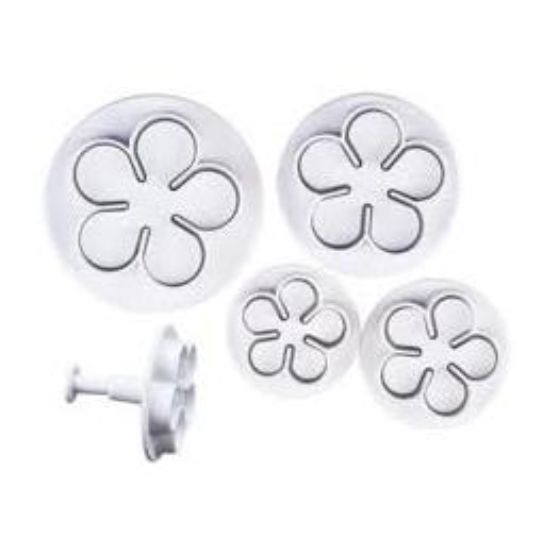 CONJUNTO DE 4 CORTADORES DE FLOR COM EJETOR – MEDIDAS 3 – 3,5 – 4,5 – 5 CM. BOLOS, MASSAS DE MODELAR, BISCUIT
