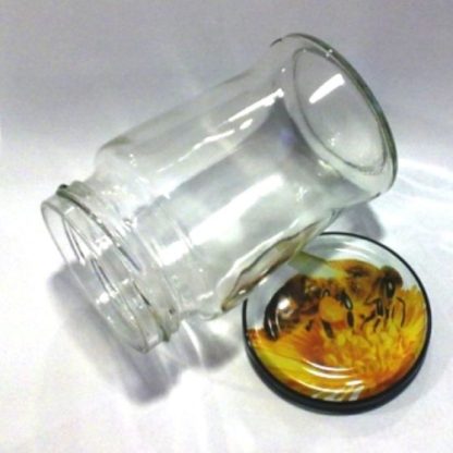 FRASCOS PARA MEL – OFERTAS E BRINDES DE CASAMENTO E BAPTIZADO – MULTIUSOS TRANSPARENTE BOCA LARGA REF.: F76 Capacidade: 300 ml Frasco: ø 7cm x 11,5 cm TAMPA METÃLICA COM ABELHA NO FAVO – Peso do frasco com tampa 170 gr