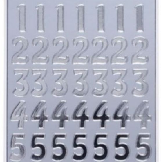 Autocolantes números prateados de 0 a 9 – medidas altura 1,8cm largura 1,4 cm. 7 unidades de cada algarismo. Ideal para scrapbooking, brindes de batizado, ofertas noivos, prendinhas de comunhão, cartoes, convites