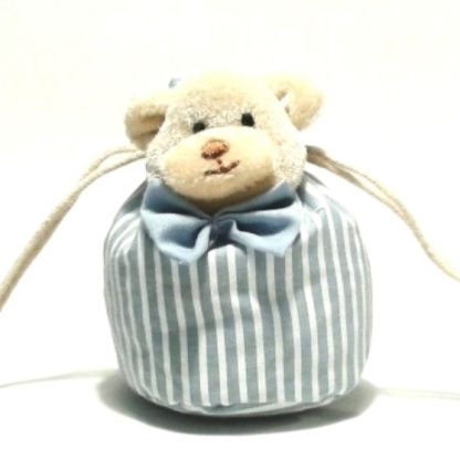 Ursinho com saquinho azul com riscas brancas e cordões para pendurar.