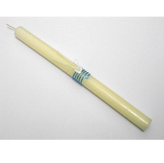 VELA DE BAPTIZADO – Vela redonda com 31×2 cm decorada com florinhas brancas, filet azul e brilhante no remate. Vela não envernizada. Fornecida com caixa. VELAS DE BAPTISMO. VELAS DE BATIZADO.